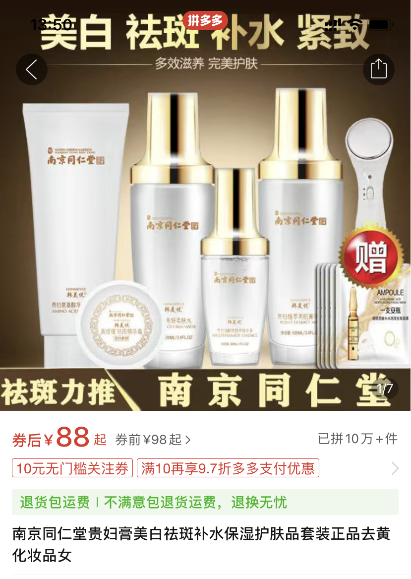 在拼多多平臺(tái),產(chǎn)品標(biāo)簽上標(biāo)示有“同仁堂”字樣的化妝品更是不在少數(shù),其中南京同仁堂防脫育發(fā)洗發(fā)露、南京同仁堂貴婦膏、北京同仁堂幽爽臻白祛斑乳霜等多個(gè)“北京同仁堂化妝品”或“南京同仁堂化妝品”銷量突破10萬(wàn)+。