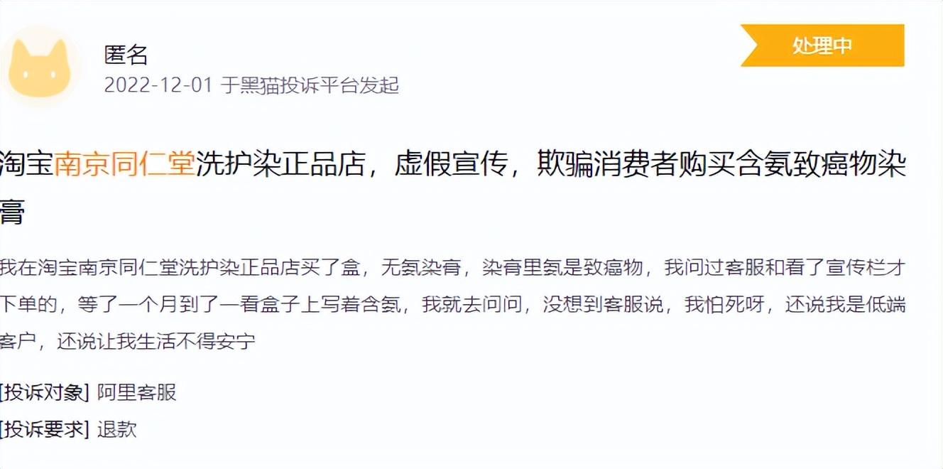 此外,記者在黑貓投訴平臺(tái)搜索發(fā)現(xiàn),涉及“南京同仁堂”的相關(guān)投訴高達(dá)304條,“虛假宣傳”、“假冒品牌”、“掛羊頭賣狗肉”、“夸大商品效果”等詞條占據(jù)大多數(shù),甚至有買家表示,淘寶南京同仁堂洗護(hù)染正品店虛假宣傳,欺騙消費(fèi)者購(gòu)買含氨致癌物染發(fā)膏。另外,在小紅書、微博、知乎等社交平臺(tái),質(zhì)疑線上“南京同仁堂”美妝產(chǎn)品的聲音也不絕于耳。