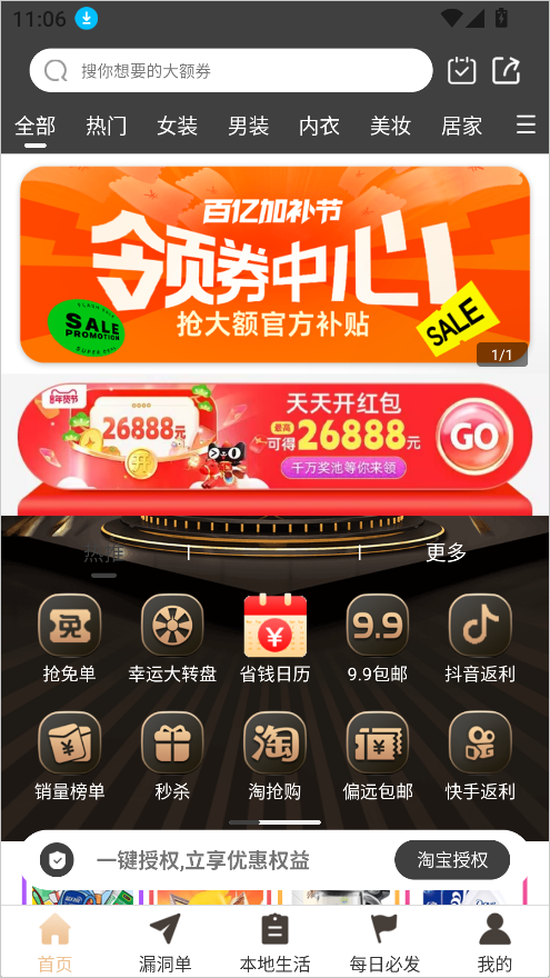 1、在本站下載安裝軟件,在首頁中可以看到有很多的優(yōu)惠福利,搶免單、幸運大轉(zhuǎn)盤、9.9包郵、抖音返利等;