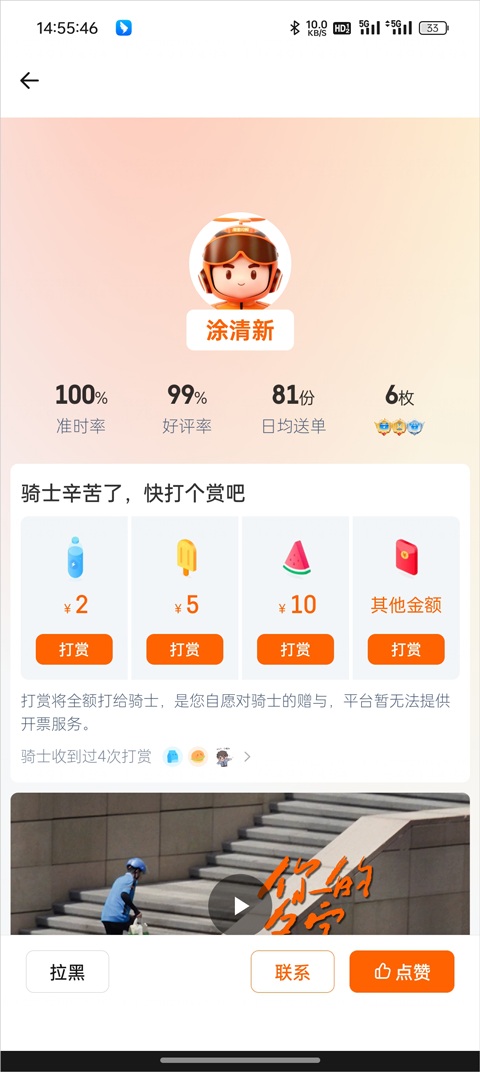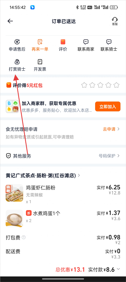 4、在訂單詳情頁中找到“打賞騎手”;