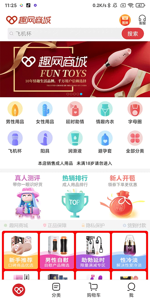 1、在首頁有詳細(xì)的產(chǎn)品分類,男性、女性以及其他更多趣味商品都有;