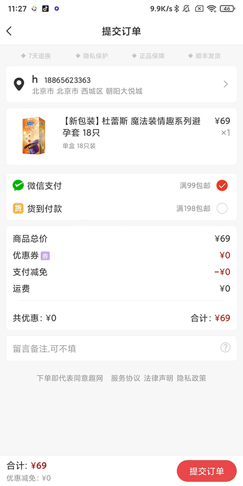 3、支持貨到付款的方式,完善個(gè)人的收貨地址等信息,確認(rèn)無誤后點(diǎn)擊【提交訂單】完成付款;
