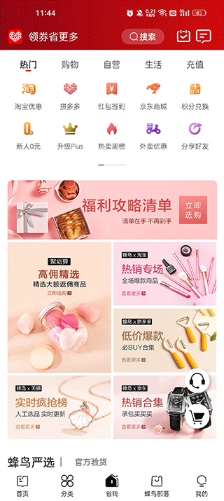 2、也可以通過底部的“省錢”,這里有很多優(yōu)惠券可以領(lǐng)取,覆蓋當(dāng)前所有熱門購(gòu)物平臺(tái);