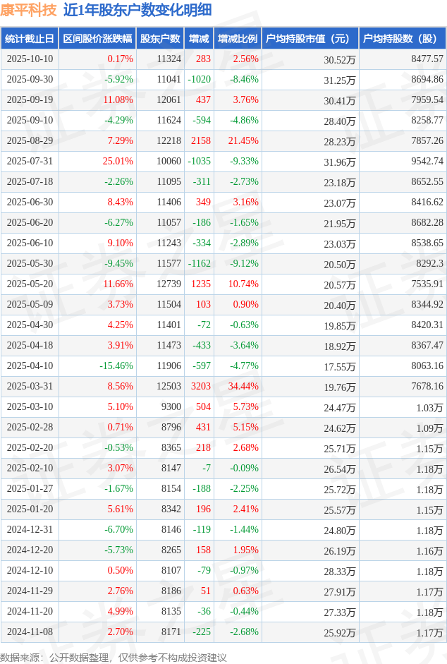 從股價(jià)來(lái)看,2025年9月30日至2025年10月10日,康平科技區(qū)間漲幅為0.17%,在此期間股東戶(hù)數(shù)增加283.0戶(hù),增幅為2.56%。