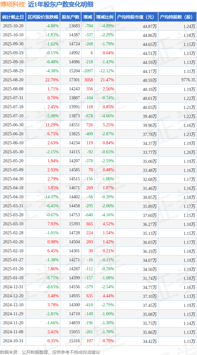 從股價(jià)來看,2025年10月10日至2025年10月20日,博碩科技區(qū)間跌幅為4.88%,在此期間股東戶數(shù)減少704.0戶,減幅為4.89%。