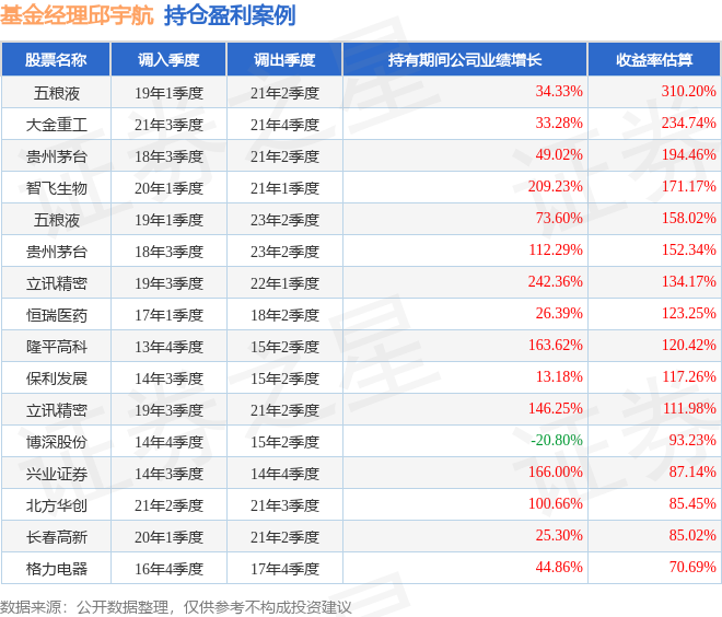 重倉(cāng)股調(diào)倉(cāng)示例詳解:   1、五糧液(000858)翻倍案例:   邱宇航管理的建信優(yōu)化配置混合A基金在19年1季度買(mǎi)入五糧液,在持有2年又1個(gè)季度后在21年2季度賣(mài)出。持有期間的估算收益率為310.2%,持有期間五糧液在2019年到2021年的年報(bào)歸屬凈利潤(rùn)增幅達(dá)34.33%。   2、博深股份(002282)調(diào)倉(cāng)案例:   邱宇航管理的建信消費(fèi)升級(jí)混合基金在14年4季度買(mǎi)入博深股份,在持有2個(gè)季度后在15年2季度賣(mài)出。持有期間的估算收益率為93.23%,持有期間博深股份在2014年到2015年的年報(bào)營(yíng)業(yè)總收入降幅為20.8%。   3、恒生電子(600570)折戟案例:   邱宇航管理的建信消費(fèi)升級(jí)混合基金在15年2季度買(mǎi)入恒生電子,在持有3個(gè)季度后在16年1季度賣(mài)出。持有期間的估算收益率為-66.15%,持有期間恒生電子在2015年到2016年的年報(bào)營(yíng)業(yè)總收入降幅為2.49%。