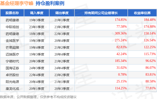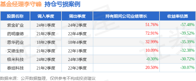 重倉(cāng)股調(diào)倉(cāng)示例詳解:   1、藥明康德(603259)翻倍案例:   李守峰管理的富安達(dá)策略精選混合基金在19年3季度買(mǎi)入藥明康德,在持有1年又2個(gè)季度后在21年1季度賣(mài)出。持有期間的估算收益率為184.48%,持有期間藥明康德在2019年到2021年的年報(bào)歸屬凈利潤(rùn)增幅達(dá)174.85%。   2、寧德時(shí)代(300750)調(diào)倉(cāng)案例:   李守峰管理的富安達(dá)策略精選混合基金在20年3季度買(mǎi)入寧德時(shí)代,在持有3個(gè)季度后在21年2季度賣(mài)出。持有期間的估算收益率為96.62%,持有期間寧德時(shí)代在2020年到2021年的年報(bào)歸屬凈利潤(rùn)增幅達(dá)185.34%。   3、紫金礦業(yè)(601899)折戟案例:   李守峰管理的富安達(dá)產(chǎn)業(yè)優(yōu)選混合A基金在24年1季度買(mǎi)入紫金礦業(yè),在持有1個(gè)季度后在24年2季度賣(mài)出。持有期間的估算收益率為-57.48%,持有期間紫金礦業(yè)在2023年到2024年的年報(bào)歸屬凈利潤(rùn)增幅達(dá)51.76%。