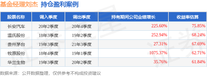 重倉股調(diào)倉示例詳解:   1、長安汽車(000625)調(diào)倉案例:   劉杰管理的平安消費精選混合A基金在20年2季度買入長安汽車,在持有2個季度后在20年4季度賣出。持有期間的估算收益率為75.85%,持有期間長安汽車在2019年到2020年的年報歸屬凈利潤增幅達225.6%。   2、溫氏股份(300498)調(diào)倉案例:   劉杰管理的平安消費精選混合A基金在18年3季度買入溫氏股份,在持有3個季度后在19年2季度賣出。持有期間的估算收益率為68.24%,持有期間溫氏股份在2018年到2019年的年報歸屬凈利潤增幅達252.94%。   3、分眾傳媒(002027)調(diào)倉案例:   劉杰管理的平安消費精選混合A基金在18年2季度買入分眾傳媒,在持有2個季度后在18年4季度賣出。持有期間的估算收益率為-32.95%,持有期間分眾傳媒在2017年到2018年的年報營業(yè)總收入增幅達21.12%。