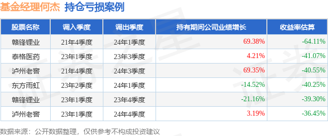 重倉股調(diào)倉示例詳解:   1、贛鋒鋰業(yè)(002460)翻倍案例:   何杰管理的前海聯(lián)合泓鑫混合A基金在19年4季度買入贛鋒鋰業(yè),在持有1年又2個(gè)季度后在21年2季度賣出。持有期間的估算收益率為315.16%,持有期間贛鋒鋰業(yè)在2019年到2021年的年報(bào)歸屬凈利潤增幅達(dá)1360.16%。   2、贛鋒鋰業(yè)(002460)調(diào)倉案例:   何杰管理的前海聯(lián)合價(jià)值優(yōu)選混合A基金在20年3季度買入贛鋒鋰業(yè),在持有3個(gè)季度后在21年2季度賣出。持有期間的估算收益率為97.46%,持有期間贛鋒鋰業(yè)在2020年到2021年的年報(bào)歸屬凈利潤增幅達(dá)410.26%。   3、贛鋒鋰業(yè)(002460)折戟案例:   何杰管理的平安低碳經(jīng)濟(jì)混合A基金在21年4季度買入贛鋒鋰業(yè),在持有2年又1個(gè)季度后在24年1季度賣出。持有期間的估算收益率為-64.11%,持有期間贛鋒鋰業(yè)在2021年到2024年的年報(bào)營業(yè)總收入增幅達(dá)69.38%。