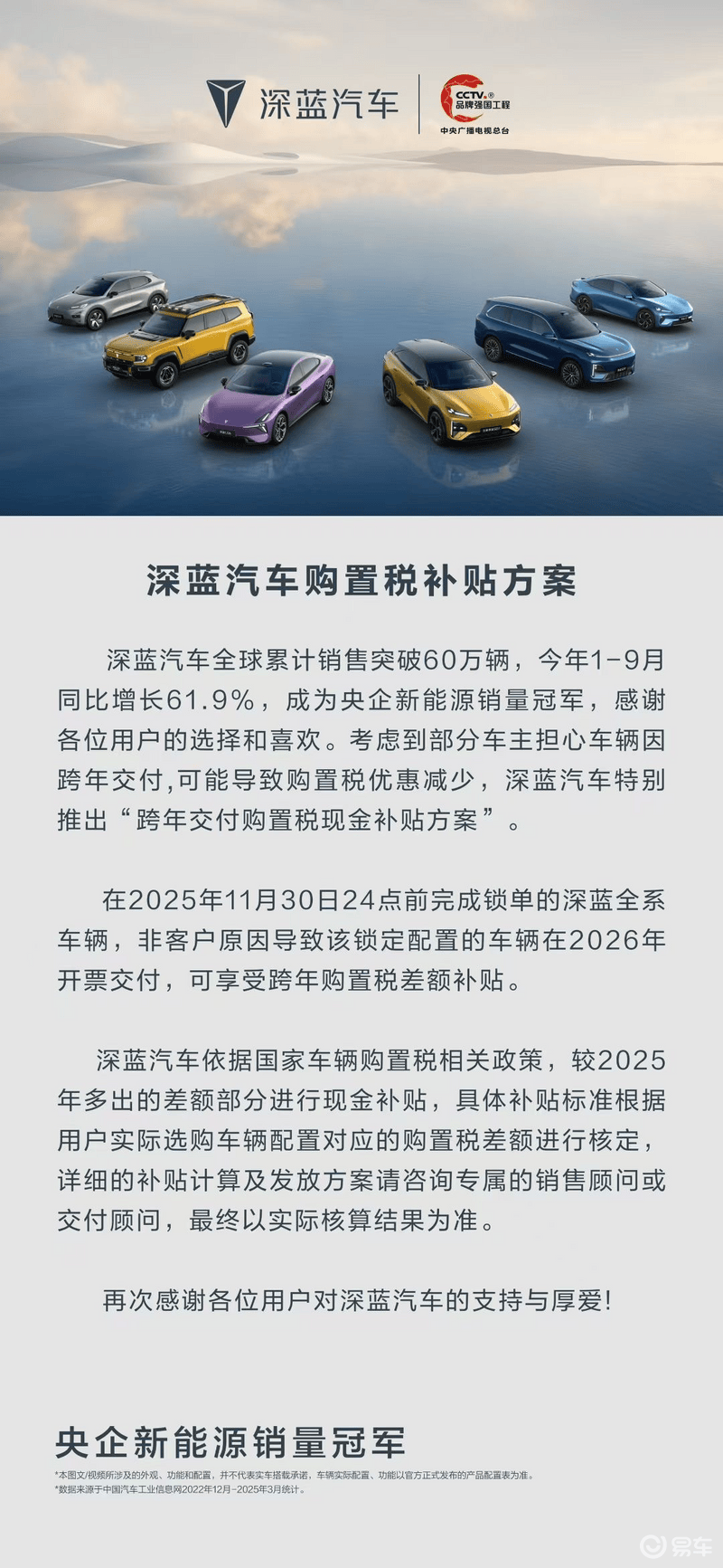 易車(chē)訊 10月25日,深藍(lán)汽車(chē)發(fā)布購(gòu)置稅補(bǔ)貼方案,用戶(hù)在2025年11月30日24點(diǎn)前完成鎖單的深藍(lán)全系車(chē)輛,非客戶(hù)原因?qū)е略撴i定配置的車(chē)輛在2026年開(kāi)票交付,可享受跨年購(gòu)置稅差額補(bǔ)貼。