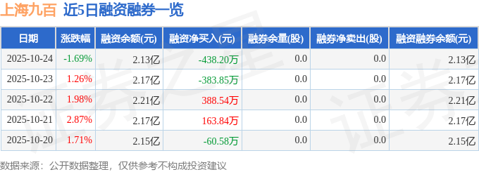 上海九百融資融券信息顯示,融資方面,當(dāng)日融資買入937.12萬元,融資償還1375.32萬元,融資凈償還438.2萬元。融券方面,融券賣出0.0股,融券償還0.0股,融券余量0.0股,融券余額0.0萬元。融資融券余額2.13億元。