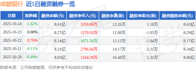成都銀行(601838)10月24日主力資金凈賣出19.75萬元