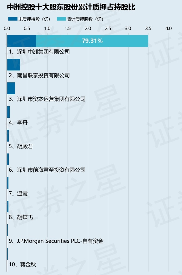 截止本公告日,股東深圳中洲集團(tuán)有限公司已累計(jì)質(zhì)押股份2.77億股,占其持股總數(shù)的79.31%。本次質(zhì)押后中洲控股十大股東的累計(jì)質(zhì)押股份占持股比例(占持股比例的計(jì)算以公司一期財(cái)務(wù)報(bào)表公布的十大股東的持股總數(shù)為基準(zhǔn))見下圖: