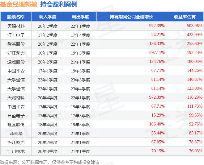重倉(cāng)股調(diào)倉(cāng)示例詳解:   1、天賜材料(002709)翻倍案例:   郭堃管理的長(zhǎng)盛同盛LOF基金在20年2季度買入天賜材料,在持有1年又3個(gè)季度后在22年1季度賣出。持有期間的估算收益率為503.96%,持有期間天賜材料在2020年到2022年的年報(bào)歸屬凈利潤(rùn)增幅達(dá)972.39%。   2、日盈電子(603286)調(diào)倉(cāng)案例:   郭堃管理的泓德泓華混合基金在17年2季度買入日盈電子,在持有1個(gè)季度后在17年3季度賣出。持有期間的估算收益率為99.55%,持有期間日盈電子在2016年到2017年的年報(bào)營(yíng)業(yè)總收入增幅達(dá)15.29%。   3、國(guó)芯科技(688262)折戟案例:   郭堃管理的長(zhǎng)盛核心成長(zhǎng)混合A基金在23年1季度買入國(guó)芯科技,在持有1年又1個(gè)季度后在24年2季度賣出。持有期間的估算收益率為-50.18%,持有期間國(guó)芯科技在2023年到2024年的年報(bào)營(yíng)業(yè)總收入增幅達(dá)27.78%。