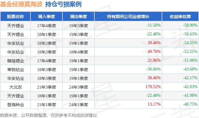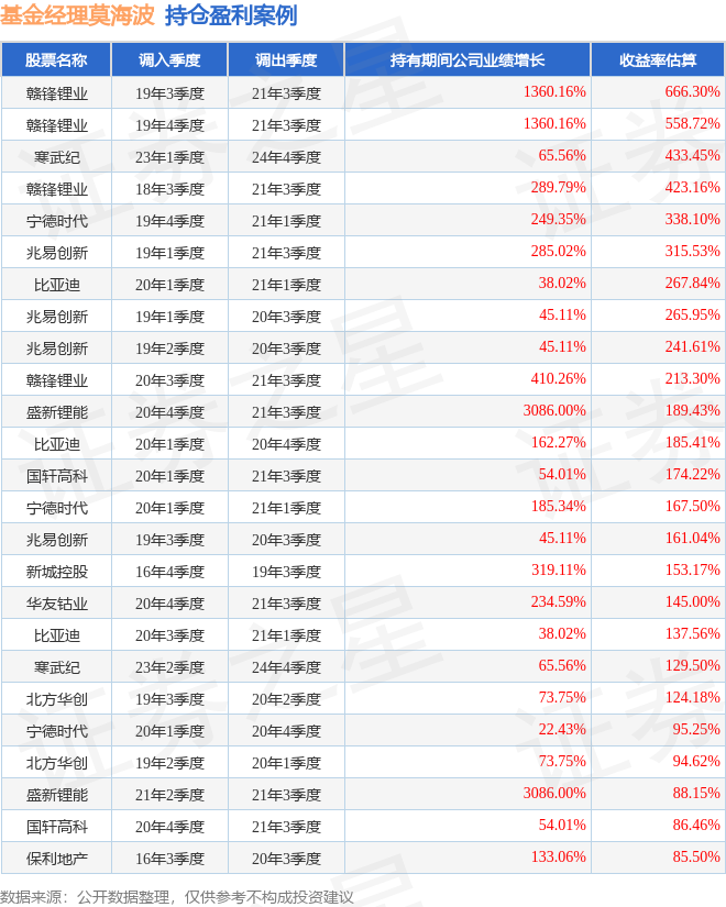 重倉股調(diào)倉示例詳解:   1、贛鋒鋰業(yè)(002460)翻倍案例:   莫海波管理的萬家品質(zhì)生活混合A基金在19年3季度買入贛鋒鋰業(yè),在持有2年又0個季度后在21年3季度賣出。持有期間的估算收益率為666.3%,持有期間贛鋒鋰業(yè)在2019年到2021年的年報歸屬凈利潤增幅達1360.16%。   2、寧德時代(300750)調(diào)倉案例:   莫海波管理的萬家臻選混合A基金在20年1季度買入寧德時代,在持有3個季度后在20年4季度賣出。持有期間的估算收益率為95.25%,持有期間寧德時代在2019年到2020年的年報歸屬凈利潤增幅達22.43%。   3、天齊鋰業(yè)(002466)折戟案例:   莫海波管理的萬家品質(zhì)生活混合A基金在17年4季度買入天齊鋰業(yè),在持有1年又3個季度后在19年3季度賣出。持有期間的估算收益率為-58.9%,持有期間天齊鋰業(yè)在2017年到2019年的年報營業(yè)總收入降幅為11.5%。