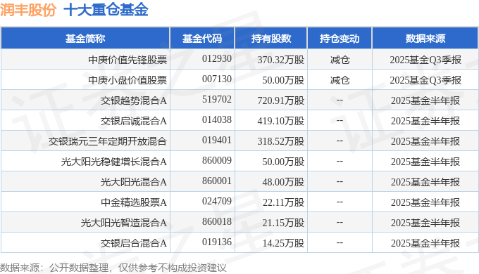 持有潤豐股份最多的基金為中庚價值先鋒股票,目前規(guī)模為32.36億元,凈值1.0744(10月24日),較上一交易日下跌0.48%,近一年上漲13.72%。該基金現(xiàn)任基金經(jīng)理為陳濤。