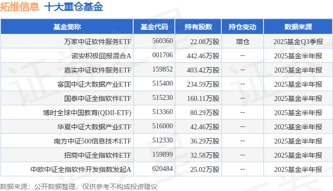 • 持有拓維信息最多的基金為萬家中證軟件服務(wù)ETF,目前規(guī)模為2.07億元,凈值1.5812(10月24日),較上一交易日上漲1.29%,近一年上漲48.71%。該基金現(xiàn)任基金經(jīng)理為賀方舟。