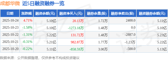 成都華微融資融券信息顯示,融資方面,當日融資買入4504.1萬元,融資償還4483.97萬元,融資凈買入20.13萬元。融券方面,融券賣出2400.0股,融券償還0.0股,融券余量1.72萬股,融券余額78.74萬元。融資融券余額5.11億元。