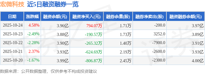 宏微科技融資融券信息顯示,融資方面,當日融資買入2539.87萬元,融資償還1745.81萬元,融資凈買入794.07萬元。融券方面,融券賣出200.0股,融券償還400.0股,融券余量1.71萬股,融券余額44.03萬元。融資融券余額3.97億元。