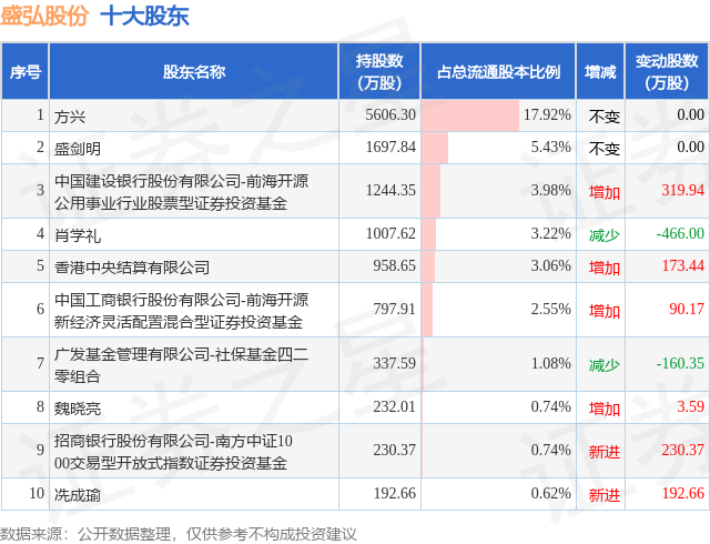 根據(jù)盛弘股份2025年中報公布的十大股東詳情如下: