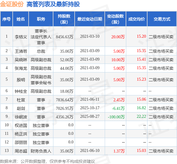 金證股份的高管列表及持股情況如下: