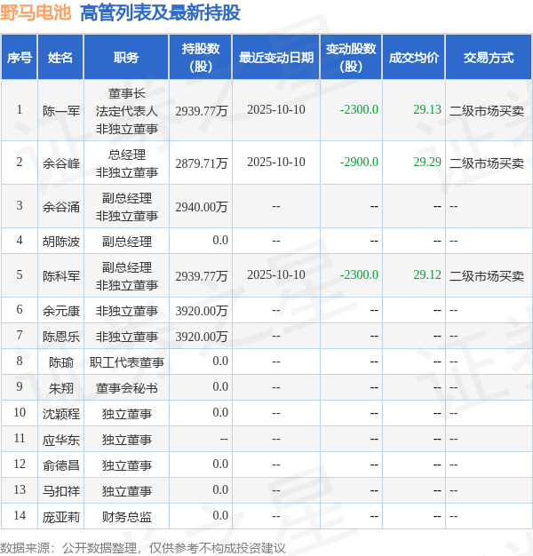 野馬電池的高管列表及持股情況如下:
