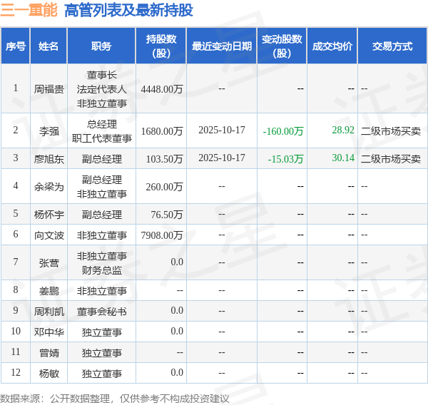 三一重能的高管列表及持股情況如下:
