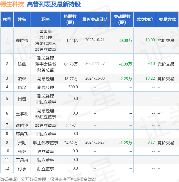 德生科技的高管列表及持股情況如下: