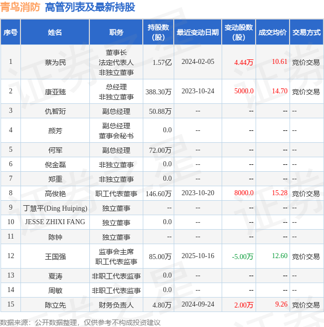 青鳥消防的高管列表及持股情況如下:
