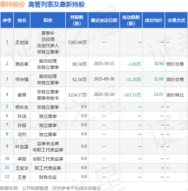 泰祥股份近半年內的董監(jiān)高及核心技術人員增減持詳情如下:
