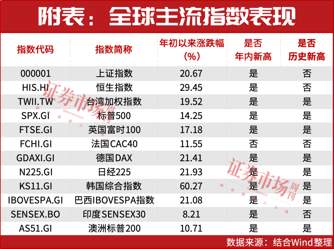 可以看到,今年以來全球主流指數(shù)幾乎都在創(chuàng)歷史新高(見附表)。當前,全球資本支出進入快速增長階段,上市公司盈利能力出現(xiàn)改善。2024年以來人工智能的爆發(fā)式發(fā)展帶動公司資本支出迅速提升,以美股為例,2025財年,微軟、谷歌、亞馬遜四家公司的資本支出有望超過3000億美元,較2024財年大幅增長。另外,主要經(jīng)濟體開啟降息周期,通脹壓力逐步緩解,流動性日益寬松,2025年全球多數(shù)地區(qū)貨幣政策進入寬松周期,美聯(lián)儲、歐洲、英國、中國、韓國、印度等央行通過降息、降準或者不同程度的貨幣寬松舉措釋放流動性。?