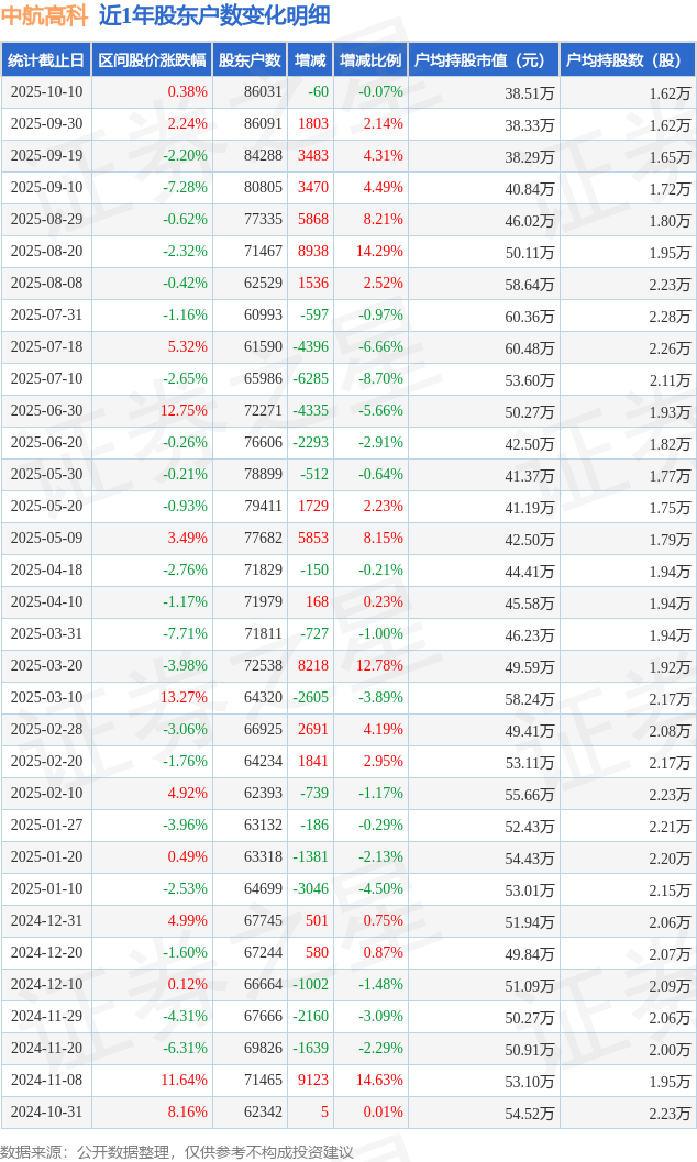從股價(jià)來(lái)看,2025年9月30日至2025年10月10日,中航高科區(qū)間漲幅為0.38%,在此期間股東戶數(shù)減少60.0戶,減幅為0.07%。