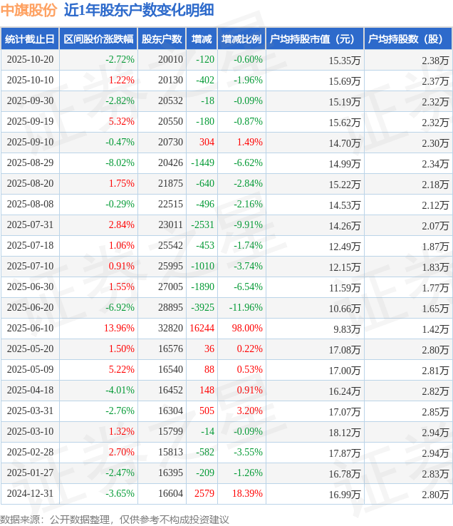 從股價來看,2025年10月10日至2025年10月20日,中旗股份區(qū)間跌幅為2.72%,在此期間股東戶數(shù)減少120.0戶,減幅為0.6%。