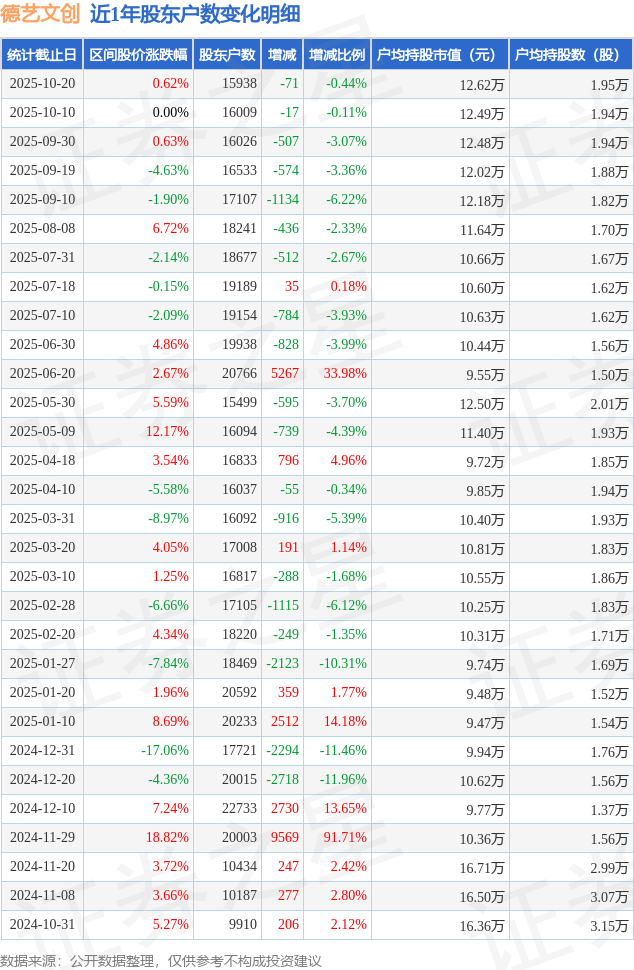 從股價(jià)來看,2025年10月10日至2025年10月20日,德藝文創(chuàng)區(qū)間漲幅為0.62%,在此期間股東戶數(shù)減少71.0戶,減幅為0.44%。