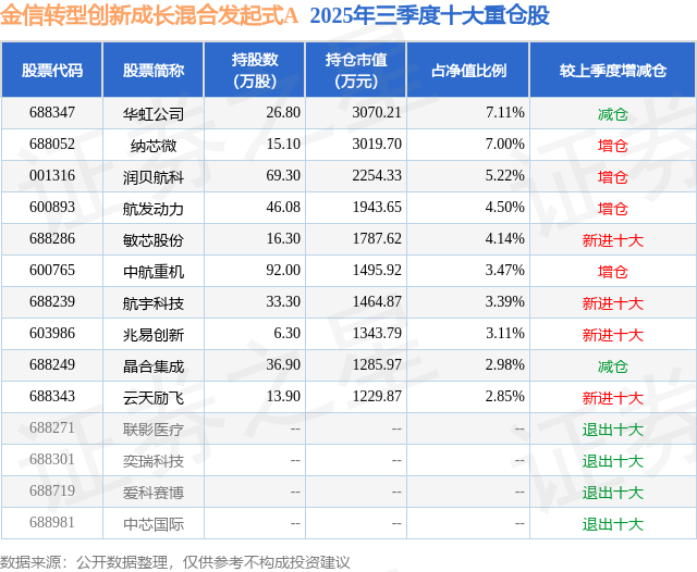 金信轉(zhuǎn)型創(chuàng)新成長混合發(fā)起式A的前十大重倉股如下:
