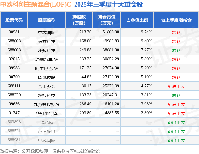 中歐科創(chuàng)主題混合(LOF)C的前十大重倉股如下: