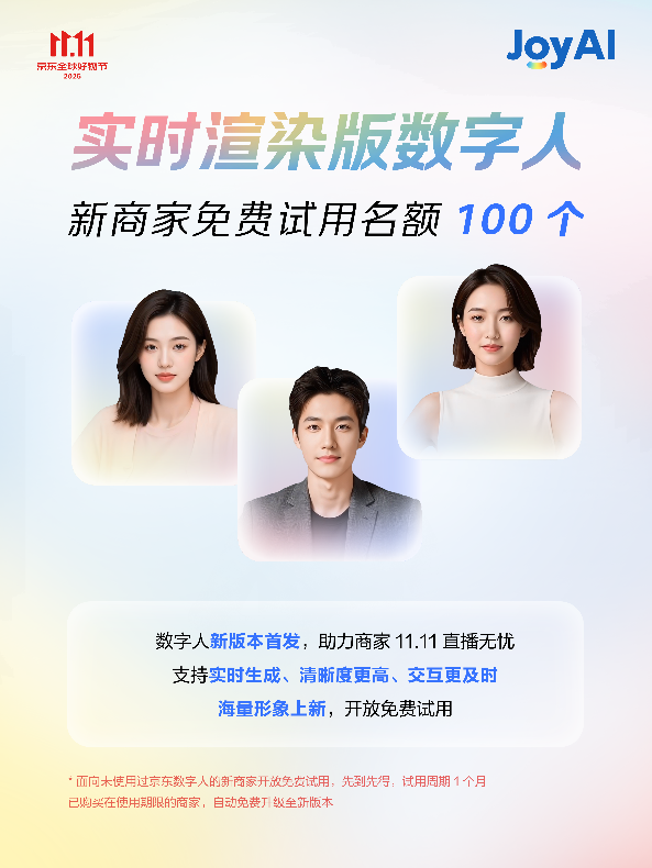 ??實(shí)時(shí)渲染數(shù)字人??面向新商家提供100個(gè)免費(fèi)試用名額,“響應(yīng)、智能、記憶”功能更加完善,支持實(shí)時(shí)生成、畫質(zhì)清晰、交互及時(shí),能夠有效降低直播成本,同時(shí)基礎(chǔ)版數(shù)字人還將持續(xù)免費(fèi)開放;??品牌定制數(shù)字人??提供100個(gè)免費(fèi)定制名額,商家可打造專屬AI主播與數(shù)字代言人;在內(nèi)容創(chuàng)作層面,??JoyGen內(nèi)容創(chuàng)作平臺(tái)??提供100個(gè)免費(fèi)賬號(hào),支持AI視頻生成與智能混剪;在客戶服務(wù)層面,??京小智5.0商家服務(wù)智能體??全面開放免費(fèi)試用,搭載大模型客服、導(dǎo)購(gòu)、跟單等能力,讓咨詢體驗(yàn)更高效,助力商家增收。