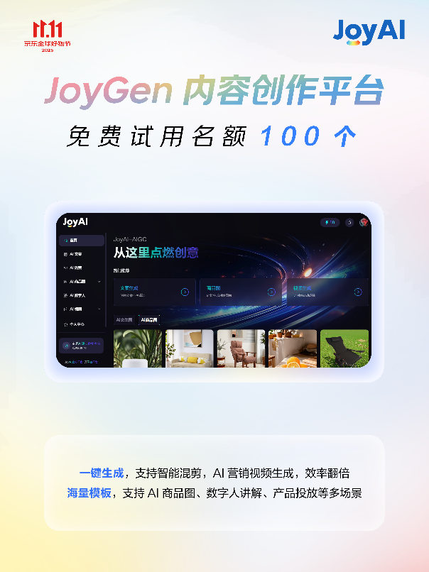 京東11.11期間,京東攜JoyAI全線產(chǎn)品,為商家提供超千萬(wàn)免費(fèi)資源與超50款專業(yè)AI工具,并推出多個(gè)核心產(chǎn)品優(yōu)惠政策。