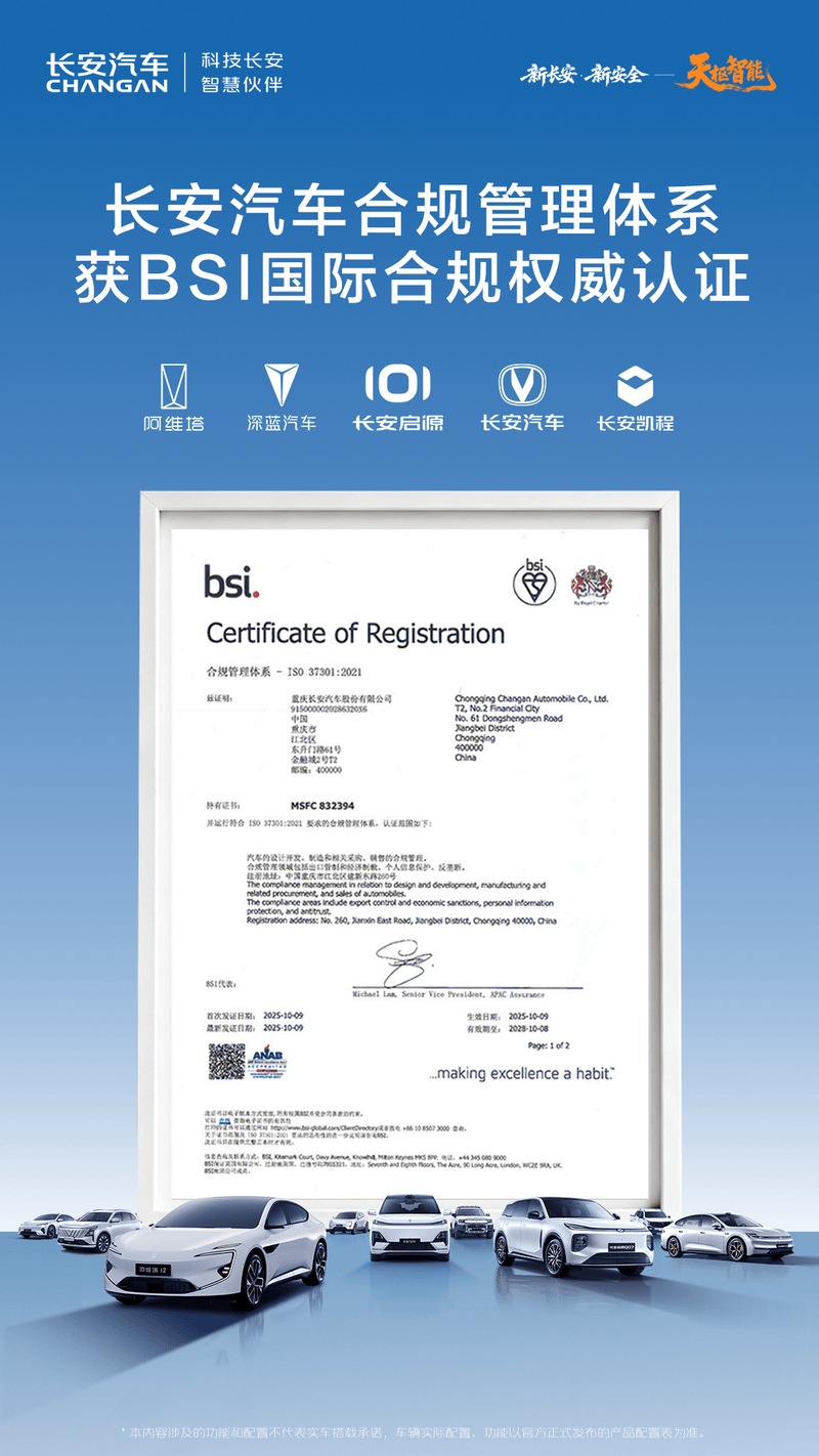 長(zhǎng)安汽車成為BSI國(guó)際合規(guī)權(quán)威認(rèn)證國(guó)資車企