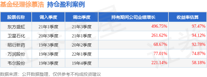 重倉股調(diào)倉示例詳解:   1、東方盛虹(000301)調(diào)倉案例:   徐慕浩管理的泰信競爭優(yōu)選混合基金在21年1季度買入東方盛虹,在持有2個季度后在21年3季度賣出。持有期間的估算收益率為97.47%,持有期間東方盛虹在2020年到2021年的年報歸屬凈利潤增幅達(dá)496.75%。   2、衛(wèi)星石化(002648)調(diào)倉案例:   徐慕浩管理的泰信競爭優(yōu)選混合基金在20年3季度買入衛(wèi)星石化,在持有2個季度后在21年1季度賣出。持有期間的估算收益率為94.12%,持有期間衛(wèi)星石化在2020年到2021年的年報歸屬凈利潤增幅達(dá)261.62%。   3、昭衍新藥(603127)折戟案例:   徐慕浩管理的泰信競爭優(yōu)選混合基金在21年4季度買入昭衍新藥,在持有2年又0個季度后在23年4季度賣出。持有期間的估算收益率為-62.2%,持有期間昭衍新藥在2021年到2023年的年報營業(yè)總收入增幅達(dá)56.69%。