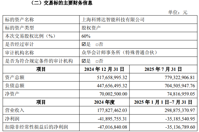 截至2024年12月31日、2025年7月31日,科博達(dá)智能科技資產(chǎn)總額分別為5.18億元、7.79億元,負(fù)債總額分別為4.48億元、7.05億元,凈資產(chǎn)分別為0.70億元、0.75億元。