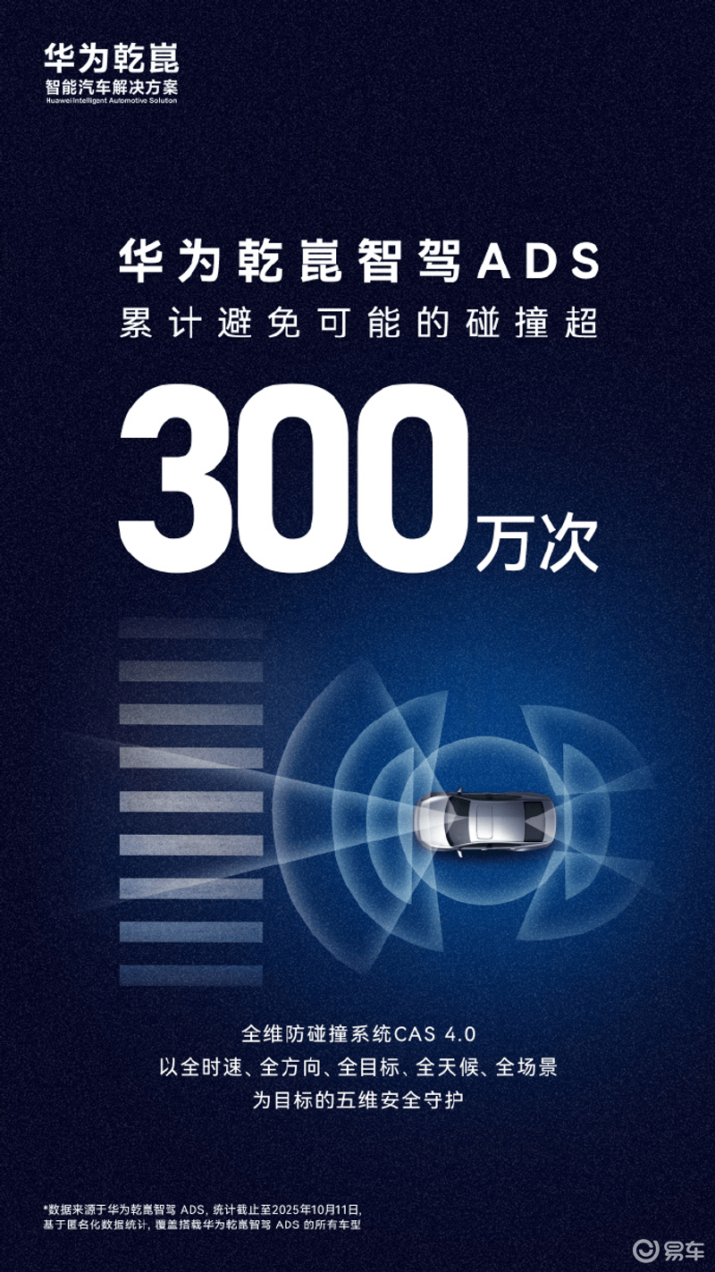 易車訊 日前,華為乾崑智能汽車解決方案宣布,華為乾崑智駕ADS已累計避免可能的碰撞超300萬次。官方表示,每一次化險為夷的背后,都離不開全維防碰撞系統(tǒng)CAS 4.0的五維安全守護。