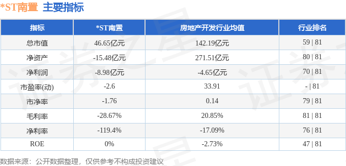 *ST南置主要指標(biāo)及行業(yè)內(nèi)排名如下: