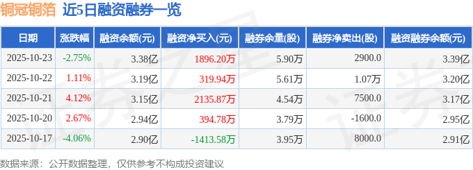 銅冠銅箔融資融券信息顯示,融資方面,當(dāng)日融資買入6857.54萬元,融資償還4961.34萬元,融資凈買入1896.2萬元,連續(xù)3日凈買入累計(jì)4352.02萬元。融券方面,融券賣出3300.0股,融券償還400.0股,融券余量5.9萬股,融券余額166.97萬元。融資融券余額3.39億元。