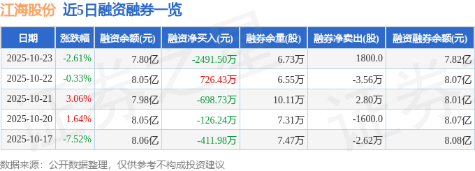 證券之星消息,截至2025年10月23日收盤(pán),江海股份(002484)報(bào)收于29.12元,下跌2.61%,換手率2.28%,成交量18.69萬(wàn)手,成交額5.45億元。