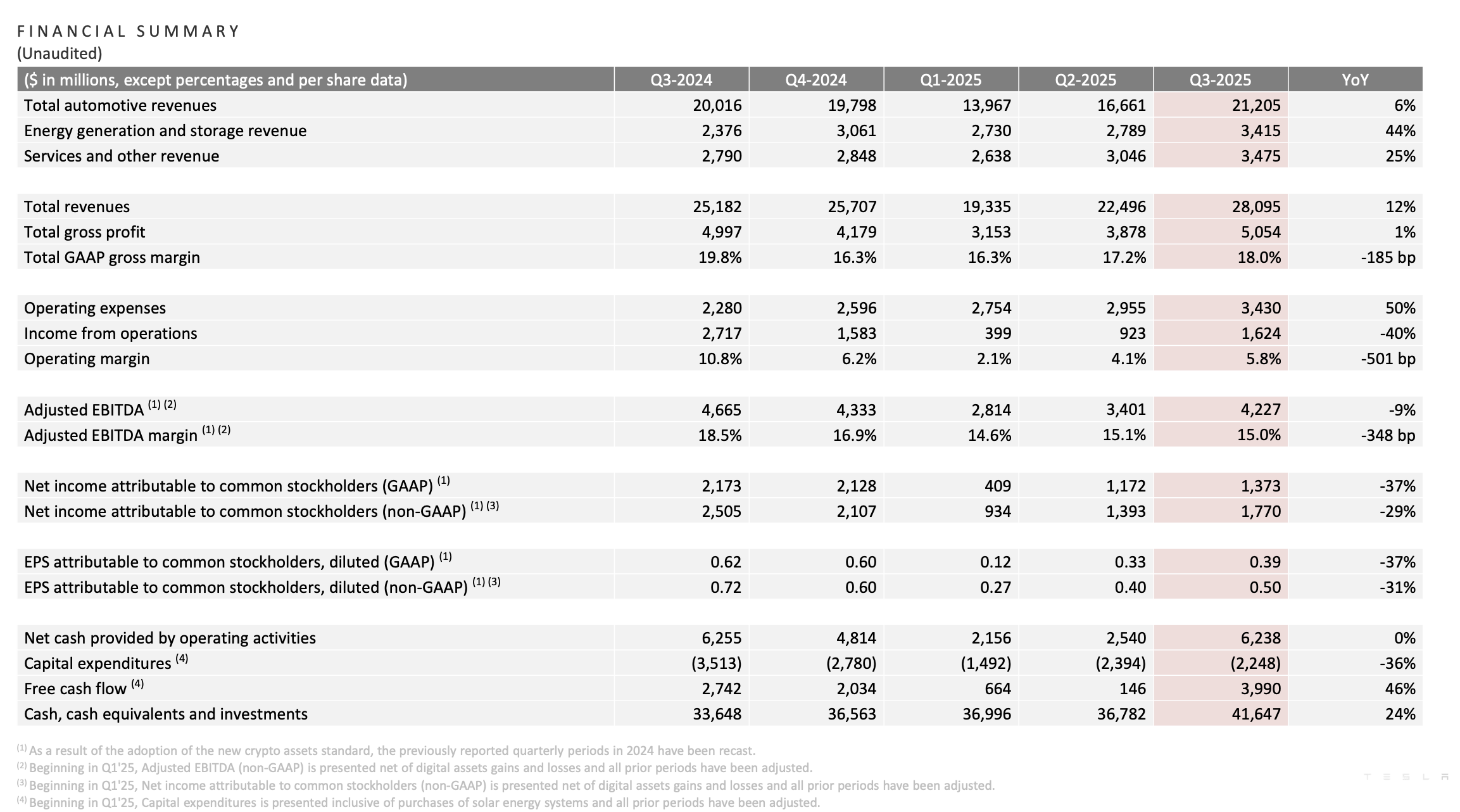 北京時(shí)間10月23日,特斯拉發(fā)布第三季度財(cái)報(bào)。財(cái)報(bào)顯示,特斯拉第三季度創(chuàng)下營(yíng)收、自由現(xiàn)金流的新紀(jì)錄,其中,營(yíng)收達(dá)281億美元,同比增長(zhǎng)12%;自由現(xiàn)金流達(dá)40億美元。