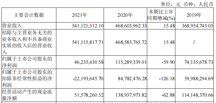 2021年,公司實(shí)現(xiàn)營(yíng)業(yè)收入5.41億元,同比增長(zhǎng)15.48%;實(shí)現(xiàn)歸屬于上市公司股東的凈利潤(rùn)4623.54萬元,同比減少59.90%;實(shí)現(xiàn)歸屬于上市公司股東的扣除非經(jīng)常性損益的凈利潤(rùn)-2219.36萬元,同比減少126.18%;經(jīng)營(yíng)活動(dòng)產(chǎn)生的現(xiàn)金流量?jī)纛~為5157.83萬元,同比減少62.88%。