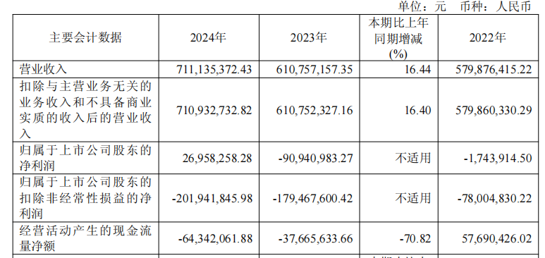2024年,公司實(shí)現(xiàn)營(yíng)業(yè)收入71113.54萬元,同比增長(zhǎng)16.44%;實(shí)現(xiàn)歸屬于母公司所有者的凈利潤(rùn)2695.83萬元;歸屬于母公司所有者的扣除非經(jīng)常性損益的凈利潤(rùn)為-20194.18萬元;經(jīng)營(yíng)活動(dòng)產(chǎn)生的現(xiàn)金流量?jī)纛~為-6434.21萬元,上年同期-3766.56萬元。