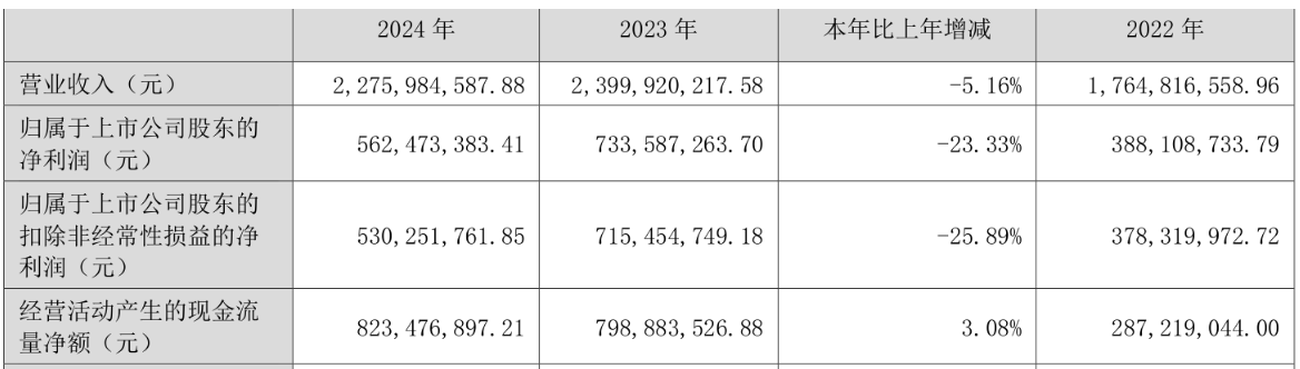 2024年,公司實(shí)現(xiàn)營(yíng)業(yè)總收入22.76億元,同比下降5.16%;歸屬于上市公司股東的凈利潤(rùn)5.62億元,同比下降23.33%;歸屬于上市公司股東的扣非凈利潤(rùn)5.30億元,同比下降25.89%;經(jīng)營(yíng)活動(dòng)產(chǎn)生的現(xiàn)金流量?jī)纛~為8.23億元,同比增長(zhǎng)3.08%。