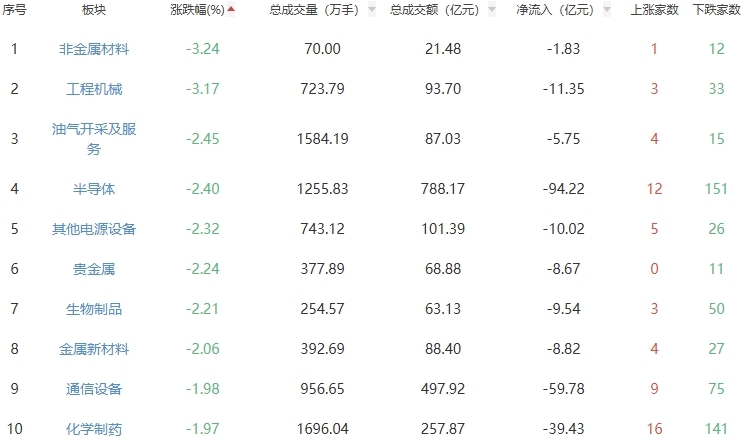 板塊方面,煤炭開采加工、影視院線、港口航運等板塊漲幅居前,非金屬材料、工程機械、油氣開采及服務(wù)等板塊跌幅居前。